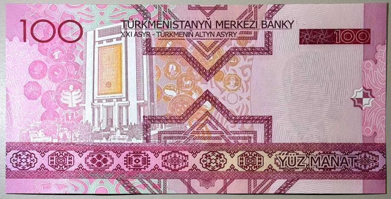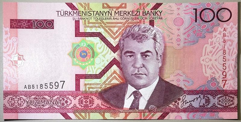2005 Türkmenistan Merkez Bankası tarafından basılmış 100 Manat nominal değerli banknottur. Ön yüzünde Türkmenistan’ın ilk Cumhurbaşkanı Saparmurat Türkmenbaşı (Niyazov) portresi yer almaktadır. Üst bölümde “Türkmenistanyň Merkezi Banky” ibaresi, alt bölümde Yüz Manat yazısı ve seri numarası AB5185597 bulunmaktadır. Arka yüzünde Türkmenistan Merkez Bankası binası tasviri ve geleneksel Türkmen motifleri yer almaktadır. 2005 tarihli seri, Türkmenistan’ın bağımsızlık sonrası dönemine ait klasik banknot serilerindendir. Kağıt yapısı diri, renkleri canlıdır. Belirgin yırtık, kopuk, delik veya ciddi deformasyon bulunmamaktadır. Koleksiyonluk temiz kondisyondadır.