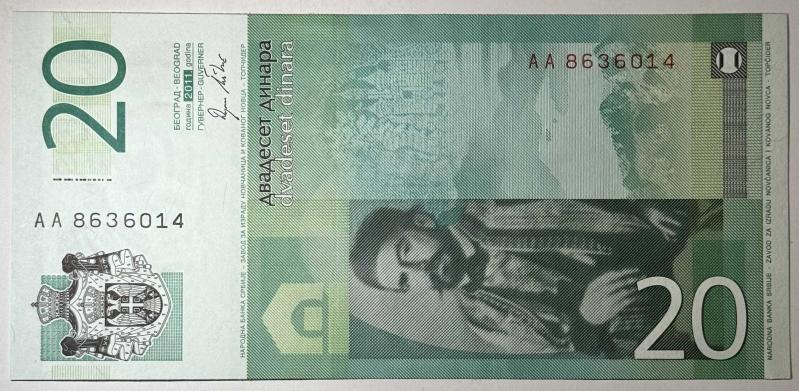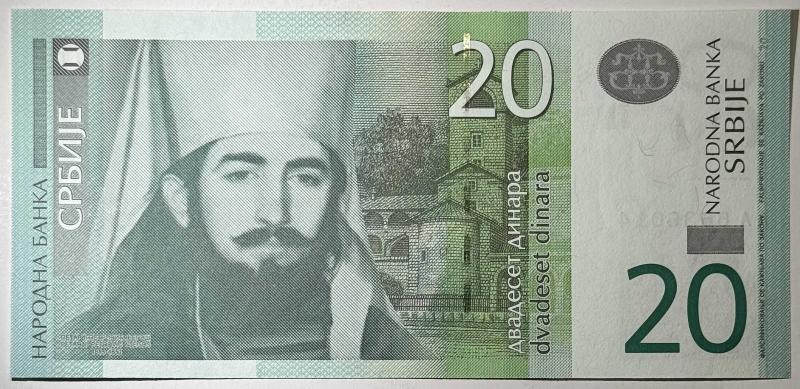 Sırbistan Merkez Bankası tarafından 2011 yılında basılmış 20 Dinara banknottur. Ön yüzde Sırp Ortodoks Kilisesi Patriği Pavle’nin portresi ve dini mimari tasviri yer almaktadır. Arka yüzde ise patriğe ait portre kompozisyonu ve Sırbistan arması bulunmaktadır. Modern güvenlik unsurları, mikro yazılar ve detaylı gravür baskısı ile koleksiyonluk niteliktedir. Görselde yer alan seri numarası: AA8636014