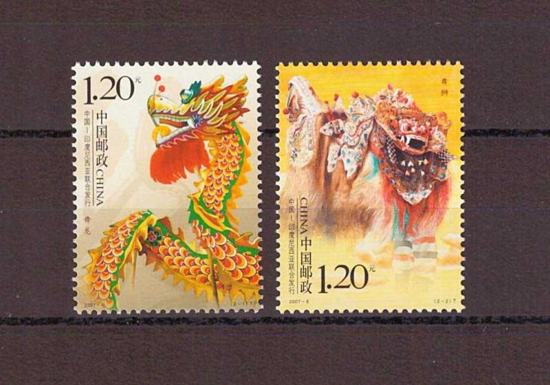 2007 Çin - Endonezya Ortak Pulu '' Ejderha ve Aslan Dansı '' Mnh Lüks Tam Seri Pul ---Ç97