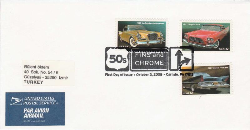 2008 AMERİKA 1950'LERİN KLASİK ARABALARI 3 PULLU VE İLKGÜN DAMGALI POSTADAN GEÇMİŞ ZARF/FDC (Üstten açılmış), en son 6 ay önce güncellenmiştir.