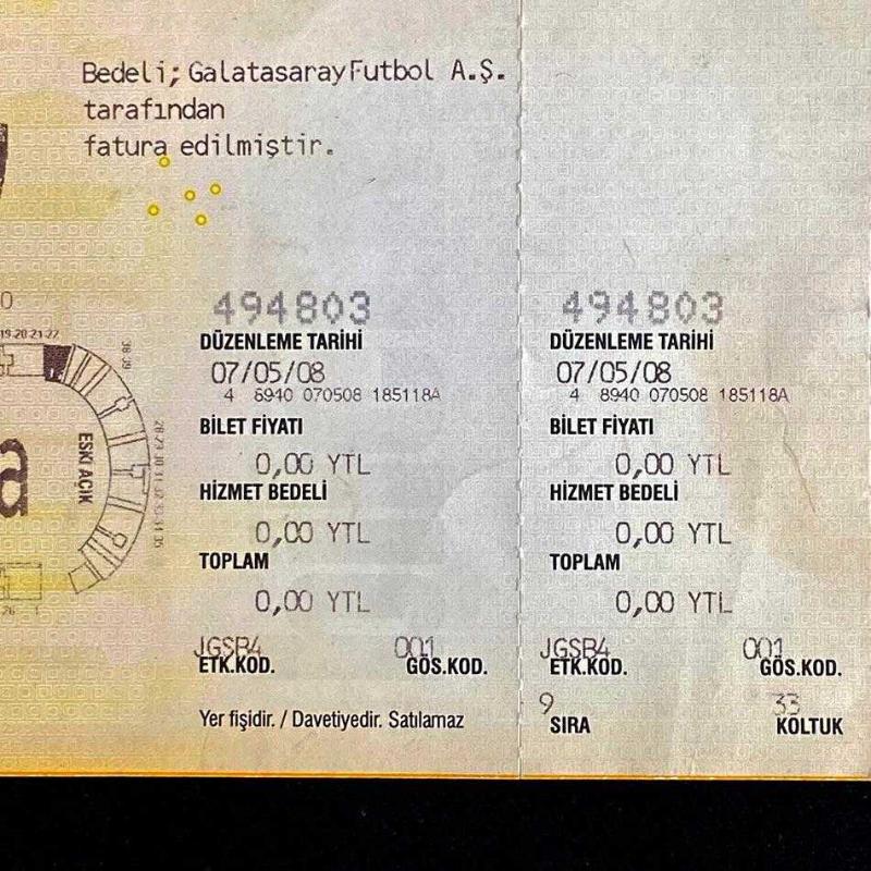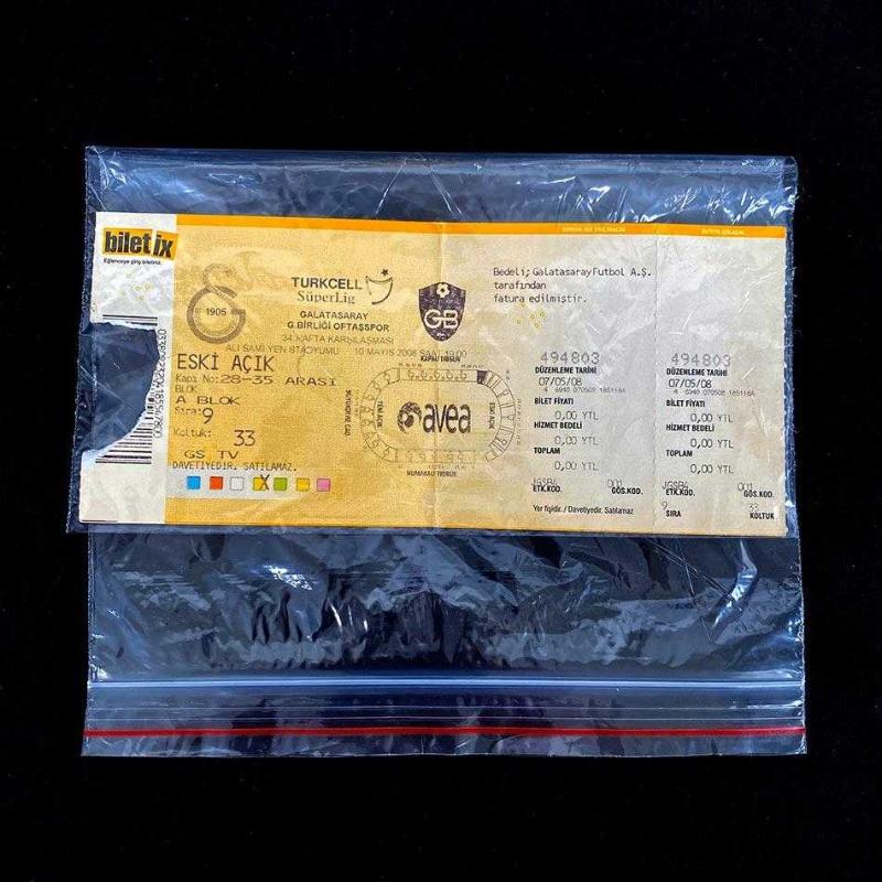Galatasaray ve futbol tarihi koleksiyonerleri için nadir bir bilet. Bilet, 10.05.2008 tarihli 34. hafta maçı olan Gençlerbirliği Oftaş futbol karşılaşmasının bileti. Eski Açık tribün bileti, Galatasaray'ın 17. şampiyonluğunu kazandığı maçın biletidir. Bilet yaşına göre iyi durumdadır, ışık görmeyecek şekilde ve hava geçirmez plastik torbada özenle muhafaz edilmiştir. 8x17 cm