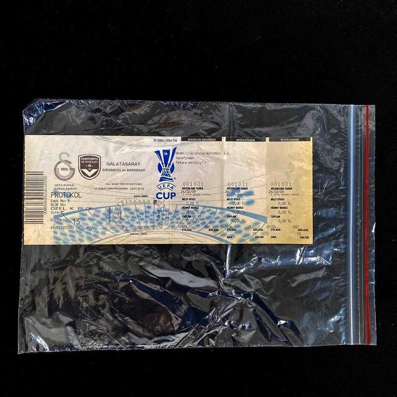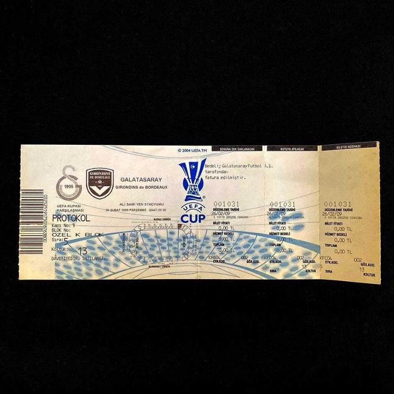 Galatasaray ve futbol tarihi koleksiyonerleri için nadir bir bilet. Bilet, Galatasaray'ın 26.02.2009 tarihli Fransız Bordeaux takımıyla eski Ali Sami Yen stadında oynadığı UEFA kupası maçının biletidir. 8x20 cm