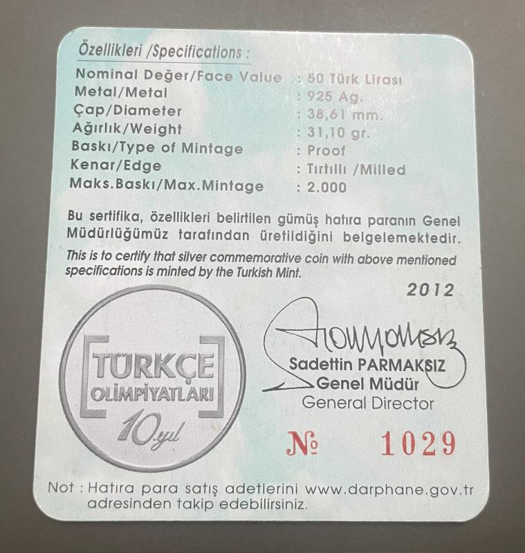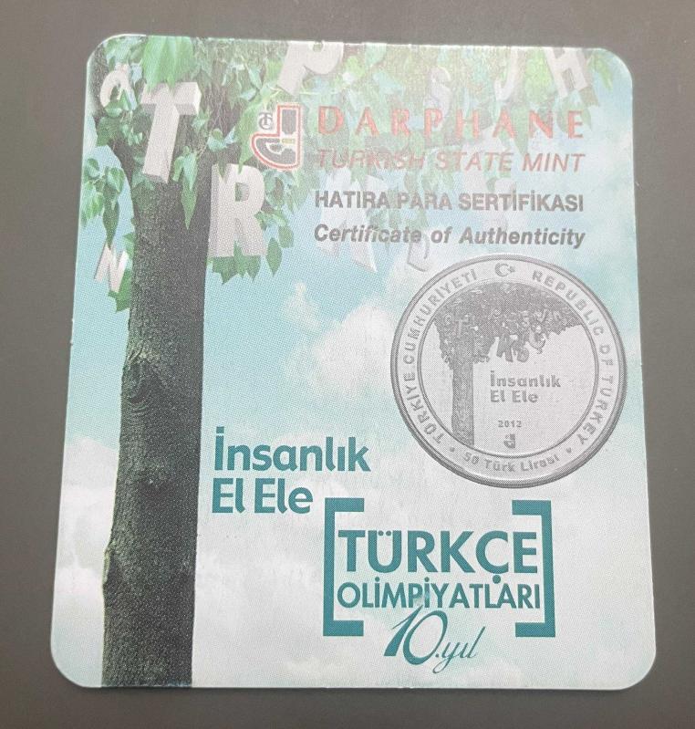2012 - Türkçe Olimpiyatları Gümüş Hatıra Para Sertifikası (Sadece Sertifika) Fotoğraflardaki sertifika gönderilecektir.
