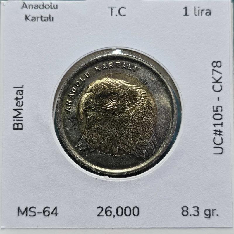 2014 Hayvanlar Serisi 1 lira Anadolu Kartalı UC#105 ÇİL/MS-64, 4 ay önce satışa sunulmuştur.