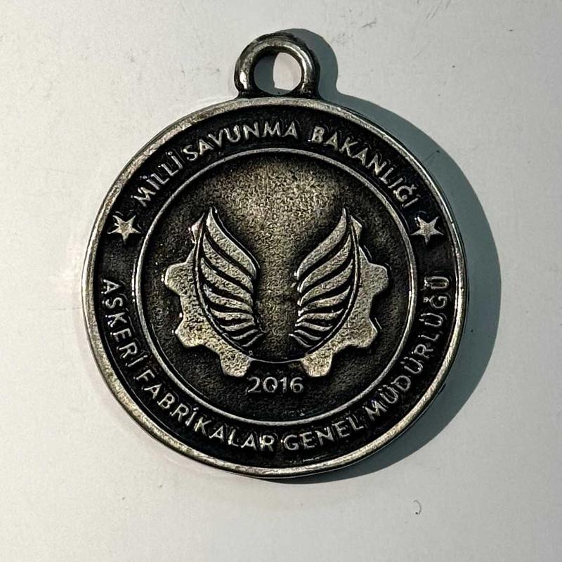 2016 yılına ait, Milli Savunma Bakanlığı bünyesinde faaliyet gösteren Askeri Fabrikalar Genel Müdürlüğü adına hazırlanmış hatıra madalyonudur. Madalyonun ön yüzünde kanatlı arma figürü ve çevresinde “Milli Savunma Bakanlığı – Askeri Fabrikalar Genel Müdürlüğü” yazısı yer almaktadır. Arka yüzü sade bırakılmış olup döneme ait resmi kurum hatıra objesi niteliği taşımaktadır. Askeri kurum koleksiyonları, askeri tarih meraklıları ve madalya koleksiyonerleri için koleksiyonluk bir parçadır. Askı halkası sağlam durumdadır. Fotoğraflardaki ürün birebir gönderilecektir. Basım Yılı: 2016 Tema: Askeri / Kurumsal Hatıra Madalyonu