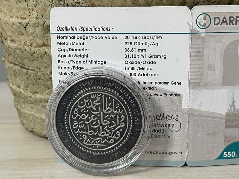 2017 - Darphane 550. Kuruluş Yıldönümü Gümüş Hatıra Para - Sertifikalı Fatih Sultan Mehmet tarafından bastırılan ilk altın para baz alınarak hazırlanmıştır. 31.10 gr 925 ayar gümüş Satış adedi: 1975 Darphane sertifikalı Çil kondisyon