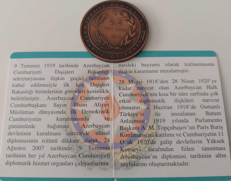 2019 AZERBAYCAN DIŞİŞLERİ BAKANLIĞININ KURULUŞUNUN 100.YILI BRONZ 2,5 TÜRK LİRASI HATIRA PARASI ORİJİNAL SERTİFİKALI ÇİL 2580 ÇOK NADİRDİR, 2 yıl önce satışa sunulmuştur.