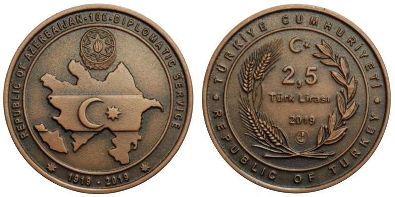 2019 Azerbaycan Dışişleri Bakanlığının Kuruluşunun 100. Yılı (Bronz) Darphane Hatıra Parası ''SERTİFİKALIDIR' *YIL / YEAR: 2019 *NOMİNAL DEĞER / FACE VALUE: 2.5 TÜRK LİRASI /TRY *METAL: BRONZ / BRONZE *ÇAP / DİAMETER: 38,61 mm *AĞIRLIK / WEİGHT: 23,33GR ±1 %GR *BASKI / TYPE OF MİNTAGE: OKSİDE / OXIDE *KENAR / EDGE: TIRTILLI / MİLLED *MAKS BASKI / MAX. MINTAGE: 5000 ADET / PCS. *TEDAVÜL SÜRESİ : 30.06.2019 - 30.06.2021 *DARPHANE SERTİFİKASI İLE BERABER KAPSÜL İÇİNDE GÖNDERİLİR. KOLEKSİYON TASFİYESİDİR... FATURA GÖNDERİLMEYECEKTİR...!!!