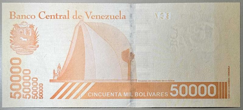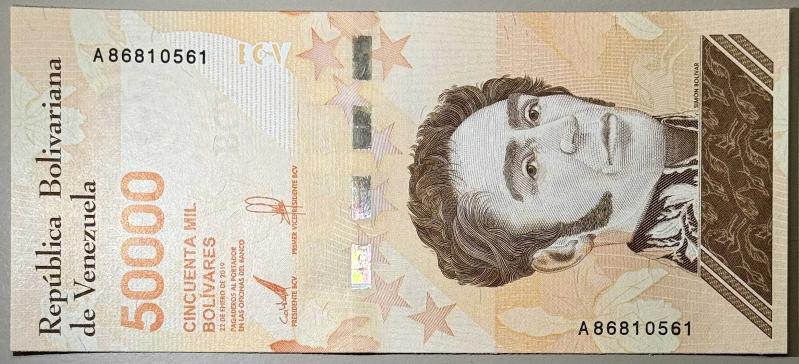 2019 Venezuela Merkez Bankası tarafından basılmış 50.000 Bolívares nominal değerli banknottur. Ön yüzünde Venezuela’nın bağımsızlık kahramanı Simón Bolívar portresi yer almaktadır. Sol bölümde “República Bolivariana de Venezuela” ibaresi, orta bölümde Cincuenta Mil Bolívares yazısı ve seri numarası A86810561 bulunmaktadır. Arka yüzünde Caracas’ta bulunan Mausoleo del Libertador Simón Bolívar tasviri yer almaktadır. Turuncu tonların hâkim olduğu bu seri, Venezuela’daki yüksek enflasyon döneminde basılmış yüksek nominal değerli banknotlardandır. Kağıt yapısı temiz ve diri, renkleri canlıdır. Belirgin yırtık, kopuk, delik veya ciddi deformasyon bulunmamaktadır. Koleksiyonluk temiz kondisyondadır.