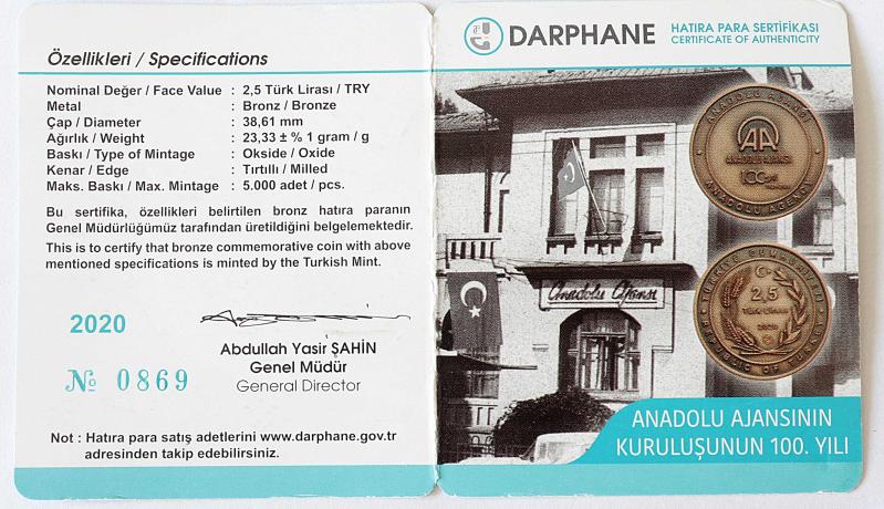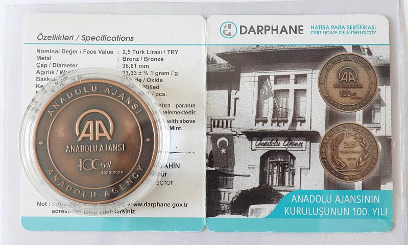 2020 Anadolu Ajansı'nın Kuruluşunun 100. Yılı (Bronz) Darphane Hatıra Parası ''SERTİFİKALIDIR', 13 saat önce satışa sunulmuştur.