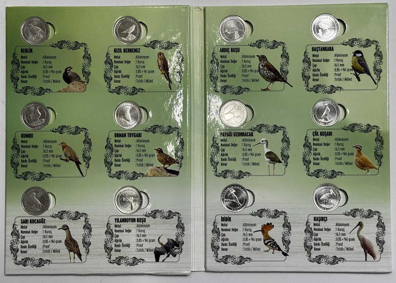 2020 yılında Darphane tarafından hazırlanan Anadoluya Özgü Kuşlar Serisi’ne ait bu özel set, Türkiye’de yaşayan farklı kuş türlerini konu alan 1 kuruş nominal değerli hatıra paralardan oluşmaktadır. Set içerisinde her biri farklı kuş türünü temsil eden 12 adet proof baskı 1 kuruş bulunmaktadır. Orijinal seri albümü içerisinde muhafaza edilen bu koleksiyon, tema bütünlüğü ve görsel zenginliği ile dikkat çekmektedir. Doğa ve numismatik temalı koleksiyonlar için özel bir settir. Basım Yılı: 2020 Tema: Anadoluya Özgü Kuşlar Serisi Metal: Alüminyum Ağırlık: 0,85 gr (her bir para) Çap: 16,5 mm Baskı Türü: Proof Durum: Set halinde, koleksiyonluk