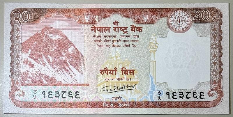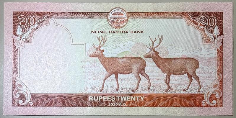 Nepal Rastra Bank tarafından 2020 (2020 A.D.) emisyonu olarak basılmış 20 Rupees nominal değerli banknottur. Ön yüzünde Nepal’in simgelerinden Himalaya Dağları (Everest silueti) ve geleneksel motifler yer almakta olup seri numarası 163336’dır. Merkez bölümde Nepalce yazılar ve banka imzaları bulunmaktadır. Arka yüzünde “NEPAL RASTRA BANK” ibaresi, doğal yaşam teması kapsamında iki geyik figürü ve dağ manzarası yer almaktadır. Alt bölümde RUPEES TWENTY – 2020 A.D. ibaresi görülmektedir. Renkleri canlı, kağıt yapısı diri ve koleksiyonluk temiz kondisyondadır. Belirgin yırtık, kopuk veya ciddi deformasyon bulunmamaktadır.