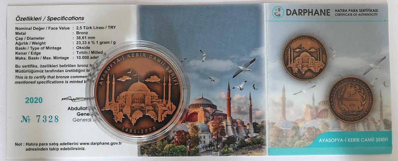 2020 YILI AYASOFYA-İ KEBİR CAMİİ ŞERİFİ AÇILIŞINA ÖZEL HATIRA PARA 2020 YILI 2.5 LİRA (SERTİFİKALI), 2 gün önce satışa sunulmuştur.