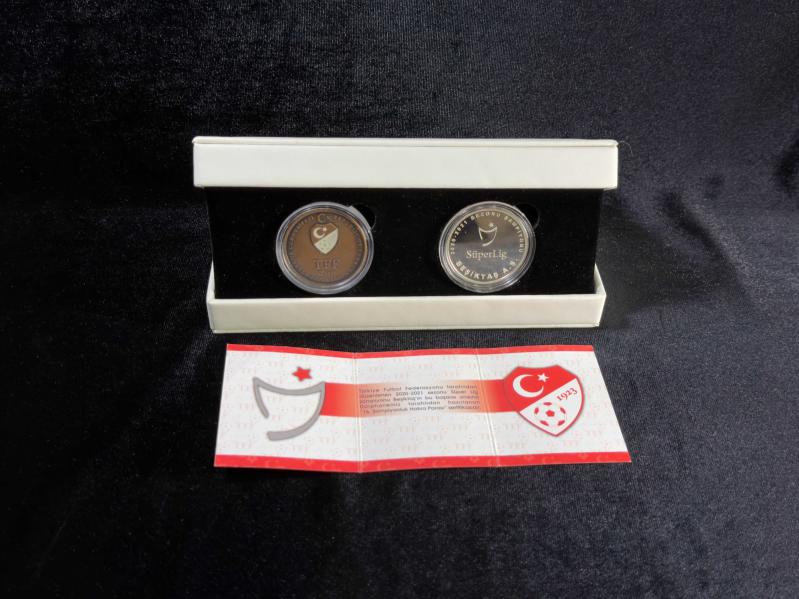 Beşiktaş A.Ş. – 2020-2021 Süper Lig Şampiyonluğu Özel Hatıra Sikke Seti (Darphane – Bronz & Gümüş) TFF x Süper Lig Lisanslı – Çift Sikke – Özel Kutusunda Beşiktaş’ın 2020–2021 Süper Lig şampiyonluğunu ölümsüzleştirmek amacıyla Darphane tarafından hazırlanan bu özel set, bir adet bronz ve bir adet gümüş hatıra sikkesinden oluşmaktadır. Hem Beşiktaş taraftarları hem de Türk futbol tarihi koleksiyoncuları için eşsiz bir hatıra niteliği taşır. Set içindeki sikkeler: • TFF Logolu Bronz Hatıra Sikkesi • 2020–2021 Süper Lig Şampiyonu Beşiktaş A.Ş. Gümüş Hatıra Sikkesi Her iki sikke kendi kapsülü içinde çil kondisyonda olup, şık özel beyaz koleksiyon kutusunda ve sertifikasıyla birlikte sunulmaktadır. Kutunun dış yüzeyinde Süper Lig, TFF, Darphane logoları ile Beşiktaş simgesi yer alır. Bu set, Beşiktaş’ın 16. şampiyonluğuna ait kalıcı bir hatıra olmasıyla birlikte, koleksiyon değeri yüksek bir futbol temalı sikke setidir. ⸻ Set İçeriği • 1 adet bronz TFF sikkesi • 1 adet gümüş Süper Lig – Beşiktaş A.Ş. şampiyonluk sikkesi • Özel tasarım beyaz koleksiyon kutusu • Sertifika • Her sikke kendi koruyucu kapsülü içinde ⸻ Sikke Özellikleri Gümüş Sikke (Beşiktaş Şampiyonluk) • Metal: 925 ayar gümüş • Ağırlık: 31,10 g ± %1 • Çap: 38,61 mm • Baskı Tipi: Proof • Kenar: Tırtıllı • Tema: Beşiktaş A.Ş. – 2020/2021 Süper Lig Şampiyonluğu Bronz Sikke (TFF Logolu) • Metal: Bronz • Ağırlık: Sertifikadaki standart bronz baskı • Çap: 38,61 mm • Baskı Tipi: Mat / parlak detaylı • Kenar: Düz veya tırtıllı (üretim varyasyonlarına göre değişebilir) • Tema: Türkiye Futbol Federasyonu – 2021 ⸻ Ürün Güvenliği (Sağlık Beyanı) Tüm ürünler koleksiyon ve sergileme amaçlıdır. Oyuncak, gıda, kozmetik veya tıbbi ürün değildir. Tedavülde geçerli değildir. Ürünleri çocukların ve evcil hayvanların erişemeyeceği yerlerde muhafaza ediniz. Güneş ışığı, yüksek ısı ve nemden uzak tutunuz. Kimyasal veya alkol bazlı temizleyici kullanmayınız. LED ışıklı kutulu ürünler pille çalışır; uzun süre açık bırakmayınız ve pilleri çocuklardan uzak tutunuz. Ambalaj malzemeleri (poşet, sünger, jel, köpük vb.) çocuklar ve evcil hayvanlar için risk oluşturabilir, lütfen uzak tutunuz. Kadife ve ahşap kutulu ürünlerde: Kutuları nemli bezle silmeyiniz; kuru ve serin ortamda saklayınız. Ürünlerde sağlığa zararlı madde bulunmaz ve sergileme amaçlı kullanım için uygundur.