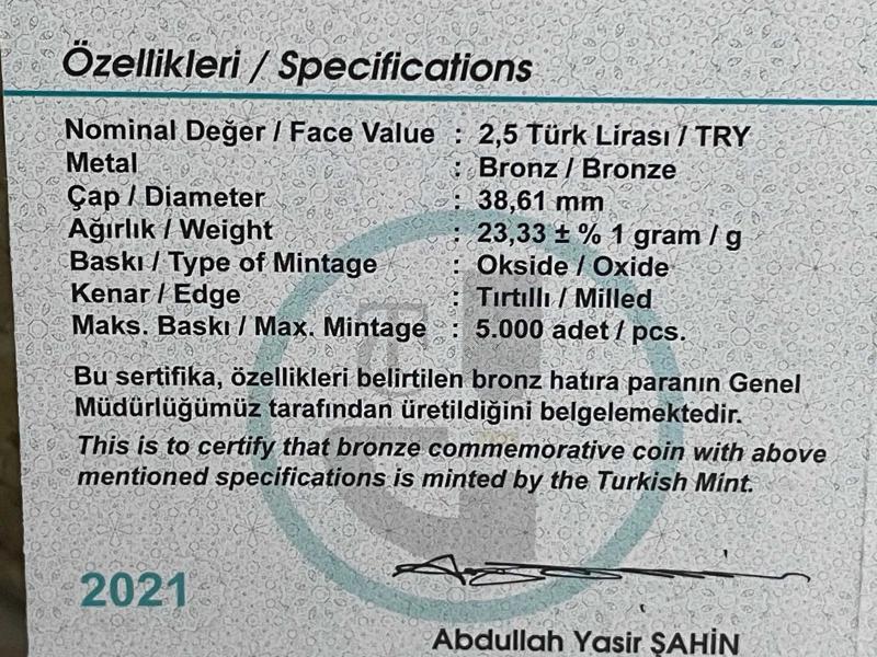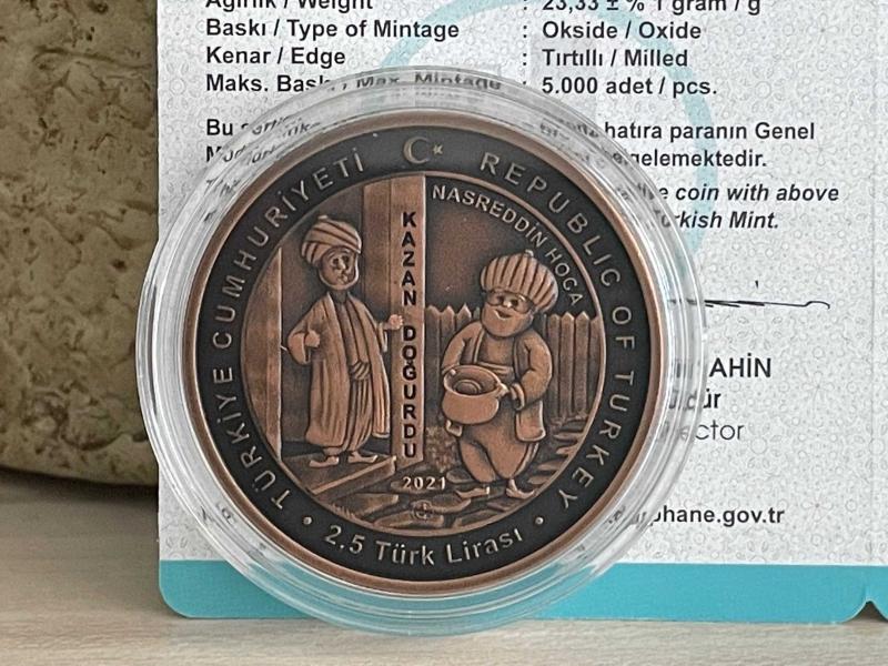2021 Nasreddin Hoca Kazan Doğurdu Bronz Hatıra Parası - Darphane sertifikalı Masal Kahramanları Serisi No:7 Metal: Bronz Çap: 38.61 mm Ağırlık: 23.33 g Baskı: Okside Maksimum Baskı Adedi: 5000 Nominal Değer: 2,5 Türk Lirası