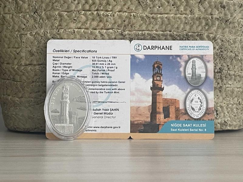 2021 - Niğde Saat Kulesi Darphane Sertifikalı Gümüş Hatıra Para Saat Kuleleri Serisi No: 8 Darphane barkodlu orjinal poşetinde Çil kondisyon 925 ayar 15.55 gr. gümüş
