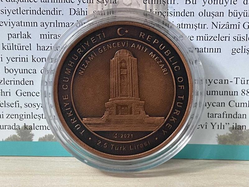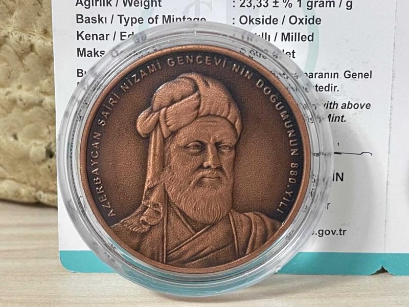 Nizami Gencevi’nin Doğumunun 880. Yılı Bronz Hatıra Parası - Darphane sertifikalı Metal: Bronz Çap: 38.61 mm Ağırlık: 23.33 g Baskı: Okside Maksimum Baskı Adedi: 5000 Nominal Değer: 2,5 Türk Lirası