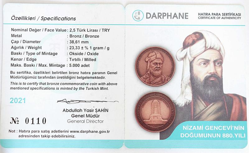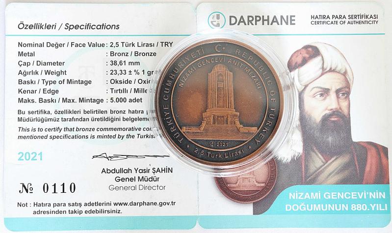 2021 YILI NİZAMİ GENCEVİ'NİN DOĞUMUNUN 880. YILI HATIRA BRONZ PARA (SERTİFİKALI) başlıklı ürün, Efemera, Müzik, Sinema > Nümismatik, Para, Madalya > Hatıra Paraları > Hatıra Parası kategorisi altında İkinci El olarak satılmaktadır.