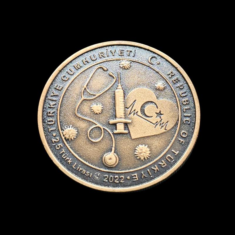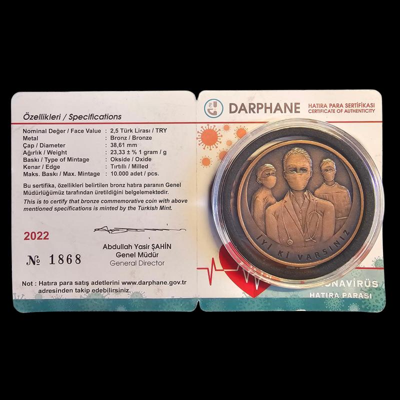 Para : 2.5 lira Hicri : 2022 Cülus : Koronavirüs Miladi : 2022 KM# : UC#361 Kondisyon : ÇİL Condition : MS-66 Basım Adedi : 10,000 Darphane : İstanbul Maden : Bronz Çap : 38.61 Ağırlık (gr.) : 23.33