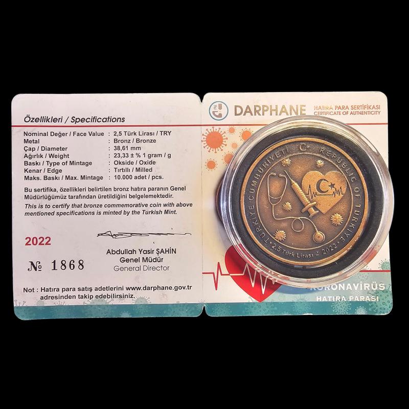 2022 2.5 Lira Sertifikalı, Kutusunda, Covid Darphane Hatıra Parası, UC#361, MS-66, ÇİL, Sadece 10,000 Basım, 12 gün önce satışa sunulmuştur.