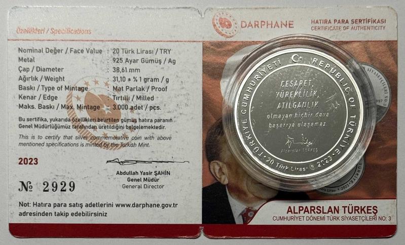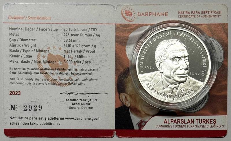 2023 Alparslan Türkeş Cumhuriyet Dönemi Türk Siyasetçileri No:3 925 Ayar Gümüş Hatıra Parası Sertifikalı, dün satışa sunulmuştur.