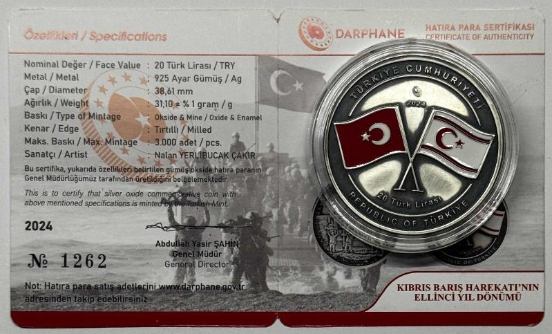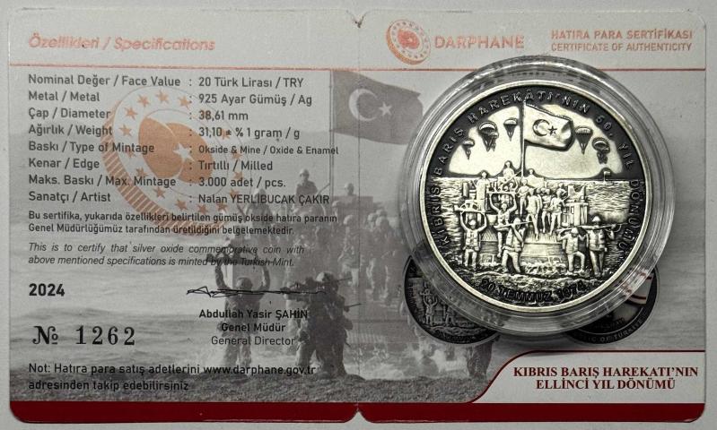 2024 Kıbrıs Barış Harekâtı’nın 50. Yıl Dönümü 925 Ayar Gümüş Okside - Mineli Hatıra Parası Sertifikalı başlıklı ürün, Efemera, Müzik, Sinema > Nümismatik, Para, Madalya > Hatıra Paraları > Hatıra Parası kategorisi altında İkinci El olarak satılmaktadır.