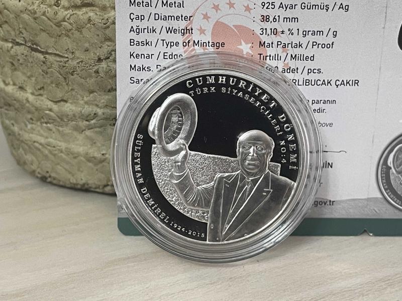 2024 - Süleyman Demirel Gümüş Hatıra Parası Cumhuriyet Dönemi Türk Siyasetçileri No:4 Darphane sertifikalı 925 ayar 31.10 gr. gümüş Çil kondisyon