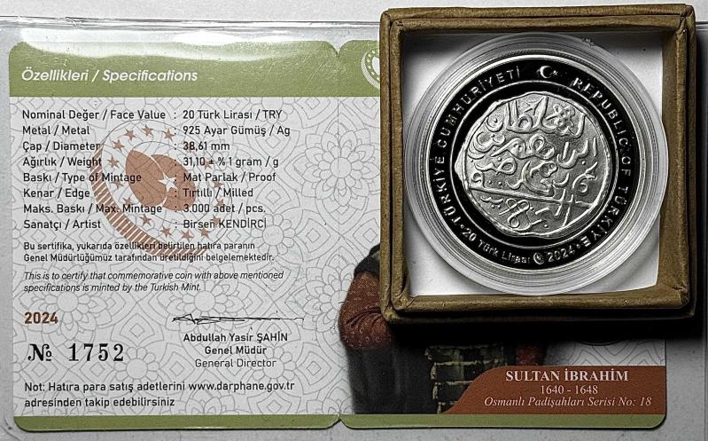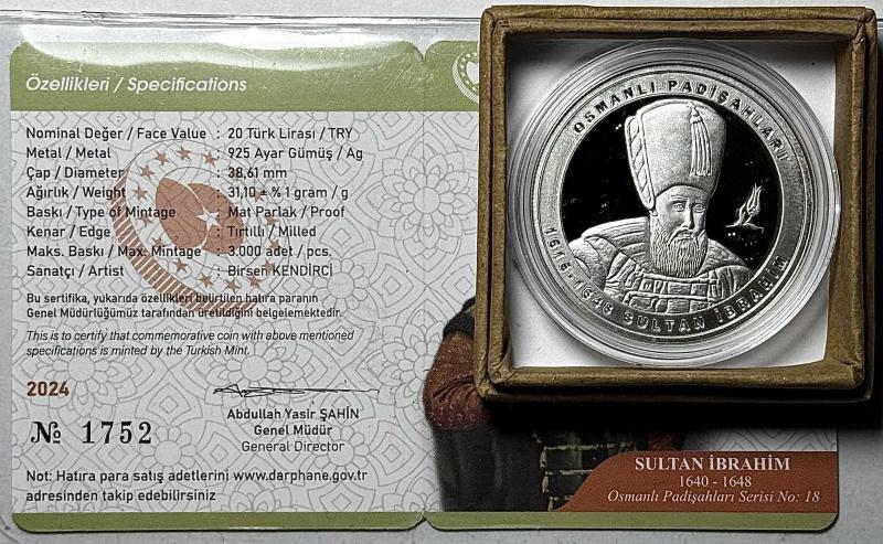 2024 Sultan İbrahim Osmanlı Padişahları Serisi No: 18 925 Ayar Gümüş Hatıra Parası Sertifikalı Orijinal Darphane Kutusunda, 5 gün önce satışa sunulmuştur.