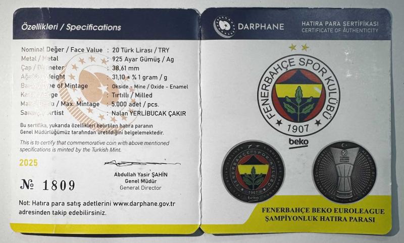 2025 Fenerbahçe Beko EuroLeague Şampiyonluk Okside Gümüş Hatıra Parası Sertifikalı (Orijinal Kutusunda), bir ay önce satışa sunulmuştur.