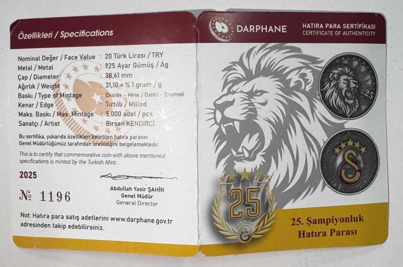 Galatasaray 25. Şampiyonluk Okside Gümüş Hatıra Parası - 2024-2025 Trendyol Süper Lig Sertifikalı ( Orjinal Kutusunda) Galatasaray'ın 2024-2025 sezonunda kazandığı 25. lig şampiyonluğu anısına Darphane tarafından basılan bu özel hatıra parası, sarı-kırmızılı tarihin en önemli kilometre taşlarından birini temsil eder. Koleksiyon değeri yüksek, prestijli ve sınırlı üretim bir parçadır. Teknik bilgiler (sertifikasında belirtildiği gibi): - Metal: 925 ayar gümüş - Çap: 38,61 mm - Ağırlık: 31,10 gr - Baskı: Okside Gümüş mine (emaye) - Kenar: Tırtıllı Ürün; orijinal kırmızı kutusu, Darphane Hatıra Para Sertifikası ve eksiksiz içeriğiyle birlikte, koleksiyon kondisyonundadır. Vitrinlik, hediye veya yatırım amaçlı ideal. Öne çıkanlar: - Galatasaray 25. Şampiyonluk temalı resmi Darphane ürünü - 925 ayar gümüş, sınırlı basım - Sertifikalı ve orijinal kutulu - Nadir ve yüksek koleksiyon değeri - Galatasaraylılar ve nümismatik koleksiyoncular için kaçırılmayacak özel bir parça.