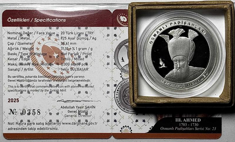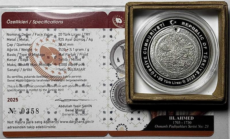 2025 III. Ahmed Osmanlı Padişahları Serisi No: 23 925 Ayar Gümüş Hatıra Parası Sertifikalı Orijinal Darphane Kutusunda başlıklı ürün, Efemera, Müzik, Sinema > Nümismatik, Para, Madalya > Hatıra Paraları > Hatıra Parası kategorisi altında İkinci El olarak satılmaktadır.
