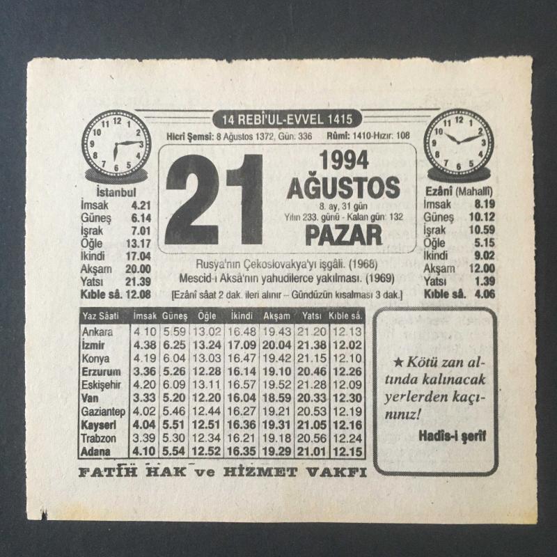 21 AĞUSTOS 1994 -TAKVİM YAPRAĞI-DOĞUM GÜNÜ HEDİYESİ-FATİH HAK VE HİZMET VAKFI TAKVİMİ,RUSYANIN ÇEKOSLAVAKYAYI İŞGALİ 1968,MESCİDİ AKSANIN YAHUDİLERCE YAKILMASI 1969,NE AMEL KILDIN,SEFİRİN CEVABI başlıklı ürün, Efemera, Müzik, Sinema > Belge ve Evraklar > Takvimler kategorisi altında İkinci El olarak satılmaktadır.
