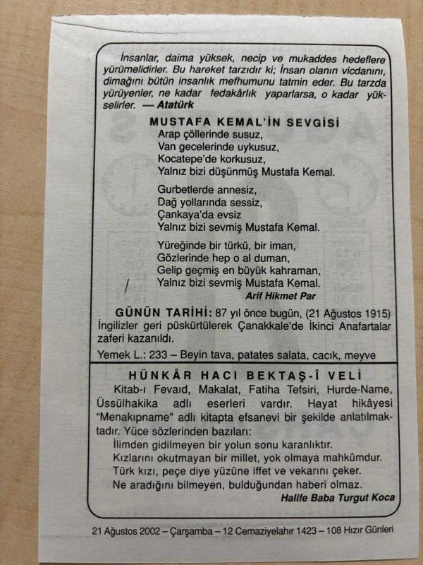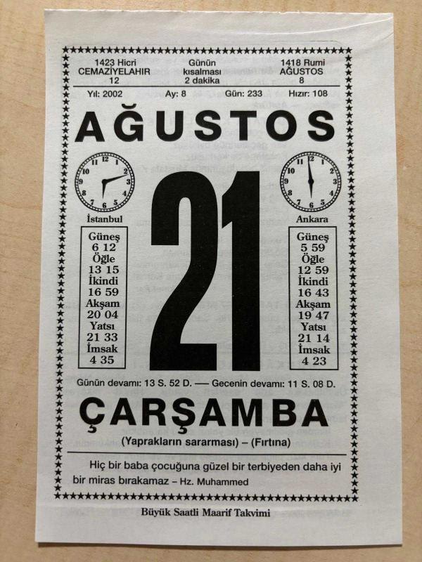 21 AĞUSTOS 2002 - TAKVİM YAPRAĞI - DOĞUM GÜNÜ HEDİYESİ - BÜYÜK SAATLİ MAARİF TAKVİMİ - HZ.MUHAMMED - ATATÜRK - ARİF HİKMET PAR - İKİNCİ ANAFARTALAR ZAFERİ - HALİFE BABA TURGUT KOCA, en son 8 ay önce güncellenmiştir.