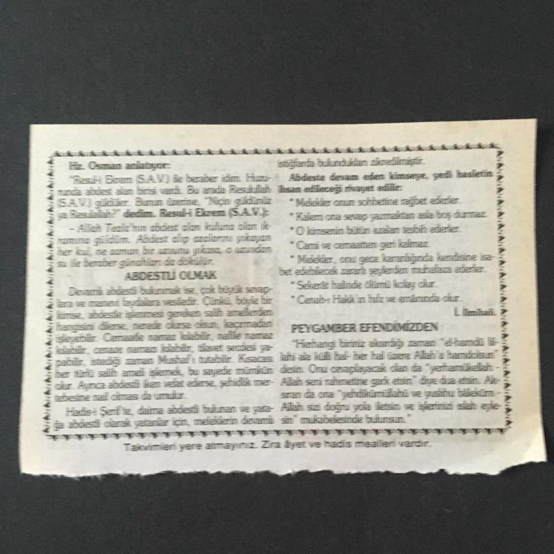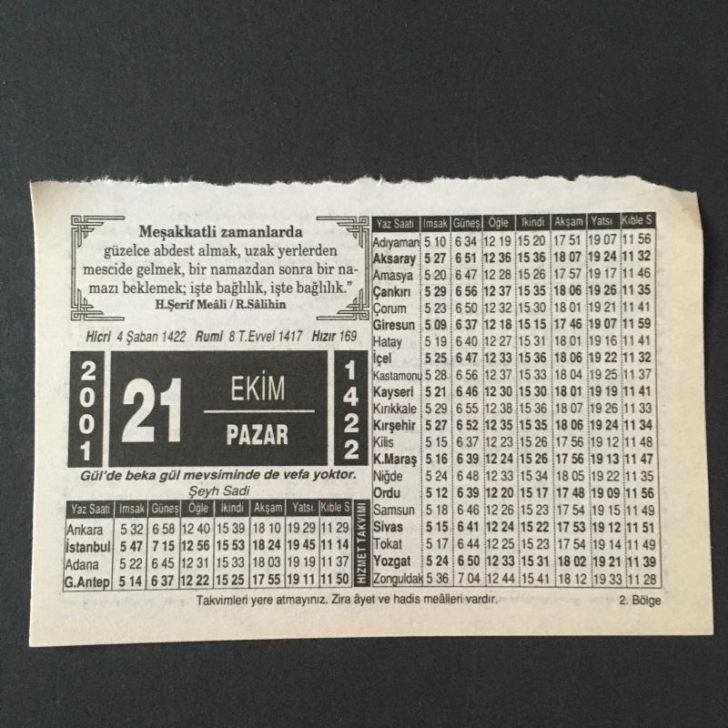 21 EKİM 2001-TAKVİM YAPRAĞI-DOĞUM GÜNÜ HEDİYESİ-HİZMET TAKVİMİ,ABDESTLİ OLMAK,PEYGAMBER EFENDİMİZDEN başlıklı ürün, Efemera, Müzik, Sinema > Belge ve Evraklar > Takvimler kategorisi altında İkinci El olarak satılmaktadır.