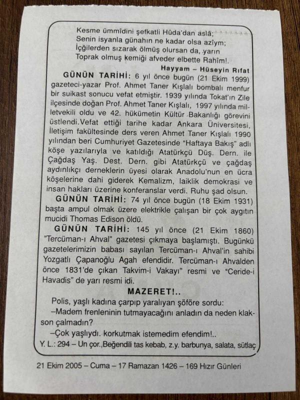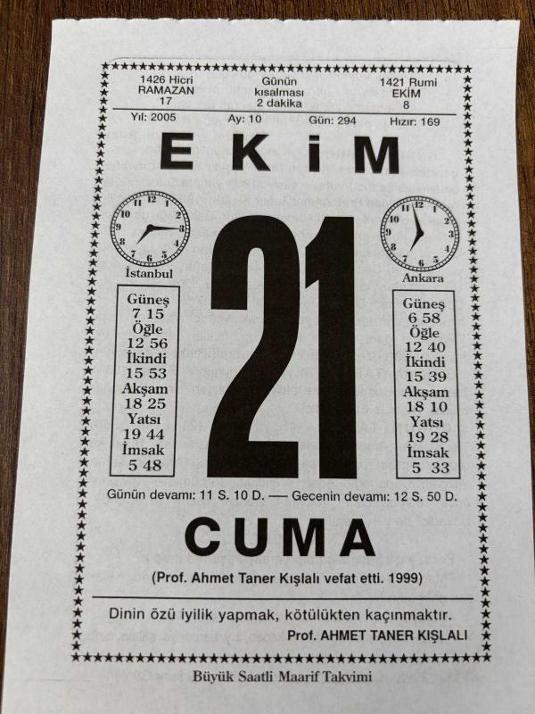 21 EKİM 2005 - TAKVİM YAPRAĞI - DOĞUM GÜNÜ HEDİYESİ - BÜYÜK SAATLİ MAARİF TAKVİMİ - PROF.DR. AHMET TANER KIŞLALI - HÜSEYİN RIFAT - PROF.DR. AHMET TANER KIŞLALI SUİKASTE UĞRADI - THOMAS EDİSON VEFAT ETTİ - TERCÜMAN-I AHVAL BASILDI, en son 8 ay önce güncellenmiştir.
