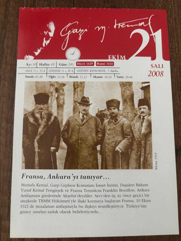 21 EKİM 2008 - TAKVİM YAPRAĞI - DOĞUM GÜNÜ HEDİYESİ - GAZİ MUSTAFA KEMAL ATATÜRK FOTOĞRAFLI BÜYÜKÇEKMECE BELEDİYESİ TAKVİMİ - Fransa, Ankara'yı tanıyor - Ankara Antlaşması - 1833- İsveçli kimya mühendisi Alfred Nobel doğdu - 1860- İlk özel siyasi gazete Tercümanı Ahval çıkmaya başladı - 1879- Thomas Edison, karbon filamanlı elektrik ampulünü icat etti - 1945- Fransa'da kadınlar, ilk kez oy kullanma hakkı elde etti - 1956- Gazeteci Hakkı Tarık Us 67 yaşında İstanbul'da öldü - 1996- Ünlü çevreci Kriton Curi vefat etti - 1999- Öğretim üyesi ve gazeteci yazar Prof. Dr. Ahmet Taner Kışlalı bombalı saldırıda öldürüldü, 6 ay önce satışa sunulmuştur.