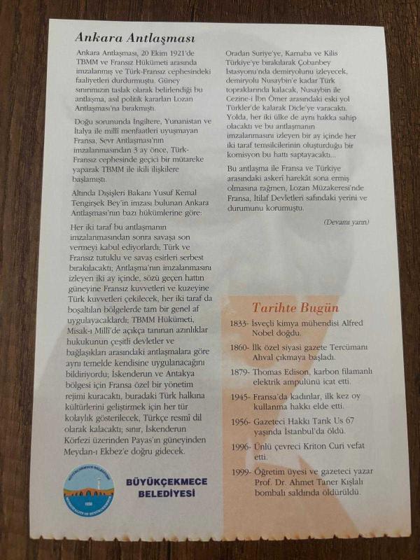 21 EKİM 2008 - TAKVİM YAPRAĞI - DOĞUM GÜNÜ HEDİYESİ - GAZİ MUSTAFA KEMAL ATATÜRK FOTOĞRAFLI BÜYÜKÇEKMECE BELEDİYESİ TAKVİMİ - Fransa, Ankara'yı tanıyor - Ankara Antlaşması - 1833- İsveçli kimya mühendisi Alfred Nobel doğdu - 1860- İlk özel siyasi gazete Tercümanı Ahval çıkmaya başladı - 1879- Thomas Edison, karbon filamanlı elektrik ampulünü icat etti - 1945- Fransa'da kadınlar, ilk kez oy kullanma hakkı elde etti - 1956- Gazeteci Hakkı Tarık Us 67 yaşında İstanbul'da öldü - 1996- Ünlü çevreci Kriton Curi vefat etti - 1999- Öğretim üyesi ve gazeteci yazar Prof. Dr. Ahmet Taner Kışlalı bombalı saldırıda öldürüldü başlıklı ürün, Efemera, Müzik, Sinema > Belge ve Evraklar > Takvimler kategorisi altında İkinci El olarak satılmaktadır.