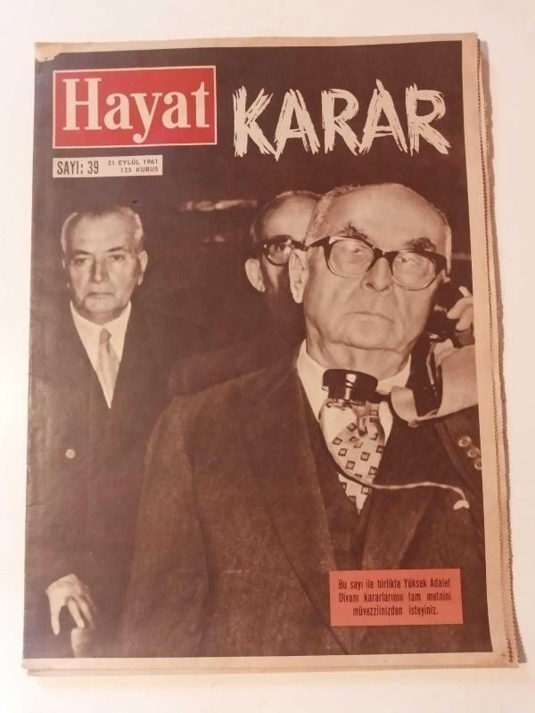 ** 21 EYLÜL 1961 HAYAT DERGİSİ KARAR BAŞLIKLI İDAMLAR KONULU SAYISI ** Sayı : 39... Orta sayfada tam bir mahkeme fotoğrafı var.. Dergi gayet temiz durumda...