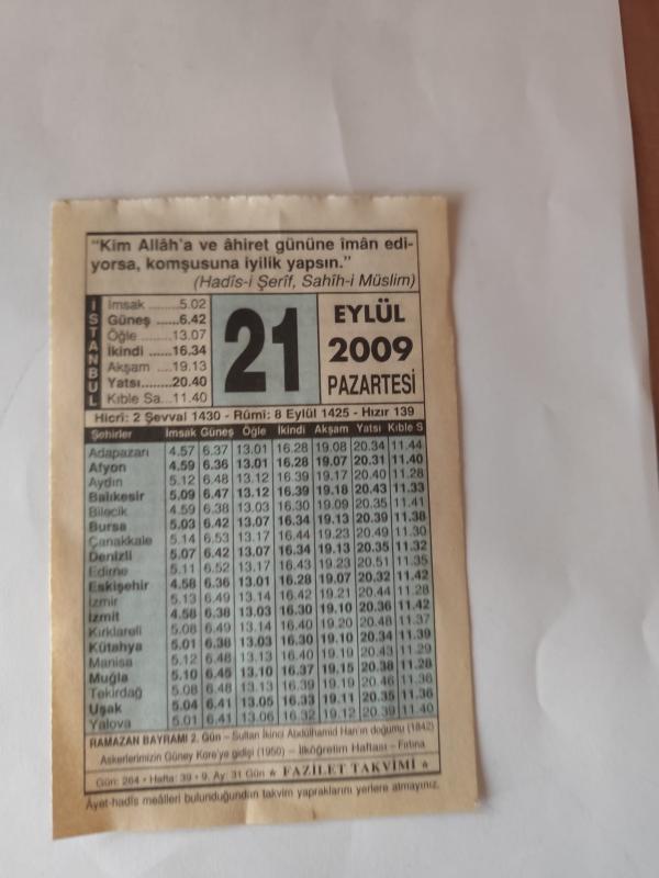 21 Eylül 2009-Orijinal Takvim Yaprağı-Doğum Günü-Söz,Nişan,Nikâh,Düğün ve Önemli Günler Hediyesi-Fazilet Takvimi-Ayet(Hadis)(Hadis-i Şerif, Sahih-i Müslim)-Ramazan Bayramı 2.Gün-Sultan Abdulhamid Han'ın Doğumu (1842)-İkramın Adabı başlıklı ürün, Efemera, Müzik, Sinema > Belge ve Evraklar > Takvimler kategorisi altında İkinci El olarak satılmaktadır.