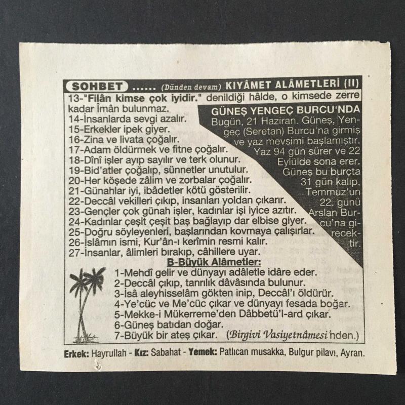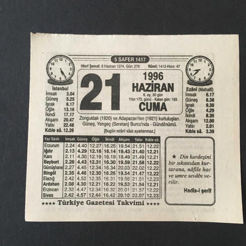 21 HAZİRAN 1996 -TAKVİM YAPRAĞI-DOĞUM GÜNÜ HEDİYESİ-TÜRKİYE GAZETESİ TAKVİMİ,ZONGULDAK 1920,VE ADAPAZARININ KURTULUŞLARI 1921,GÜNDÖNÜMÜ,GÜNEŞ YENGEÇ BURCUNDA,KIYAMET ALAMETLERİ 2 başlıklı ürün, Efemera, Müzik, Sinema > Belge ve Evraklar > Takvimler kategorisi altında İkinci El olarak satılmaktadır.