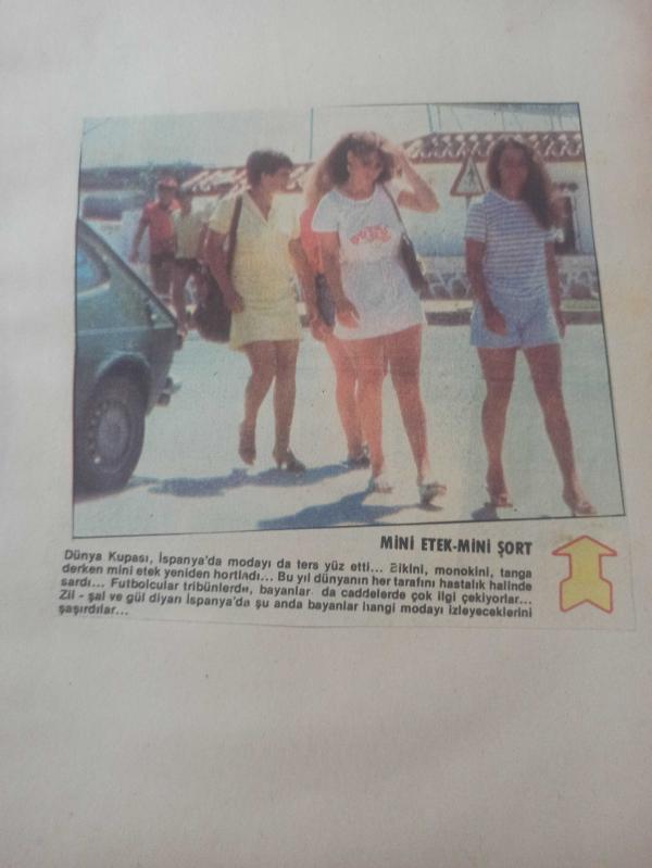 21 Haziran 1982 - Mini Etek - Mini Şort - Dünya Kupası, İspanya'da modayı da ters yüz etti - Bikini, monokini, tanga derken mini etek yeniden hortladı... Bu yıl dünyanın her tarafını hastalık halinde sardı - Gazete haberi - Tek Yaprak Arkalı Önlüdür, Erol Duru tarafından kaleme alınmıştır. Kitap 1982 yılında yayınlanmıştır. 2 sayfadır. 21 Haziran 1982 - Mini Etek - Mini Şort - Dünya Kupası, İspanya'da modayı da ters yüz etti - Bikini, monokini, tanga derken mini etek yeniden hortladı... Bu yıl dünyanın her tarafını hastalık halinde sardı - Gazete haberi - Tek Yaprak Arkalı Önlüdür adlı eser Türkçe dilindedir.
