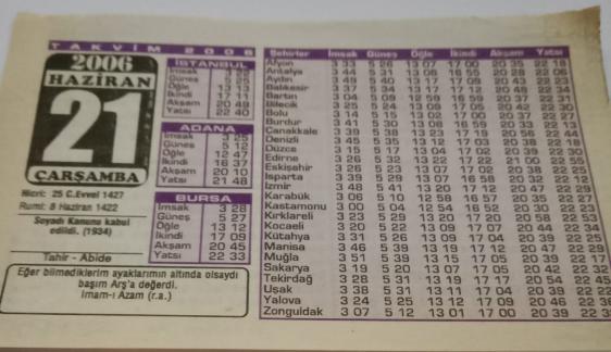 21 Haziran 2006-Orijinal Takvim Yaprağı-Doğum Günü-Söz,Nişan,Nikâh,Düğün ve Önemli Günler Hediyesi-Bizim Anadolu Takvimleri-Ayet-Hadis(Imam-I Azam (r.a.))(Soyadı Kanunu kabul edildi. (1934))-Tahir - Abide-Azim, en son 2 ay önce güncellenmiştir.