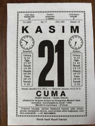 21 KASIM 2003 - TAKVİM YAPRAĞI - DOĞUM GÜNÜ HEDİYESİ - BÜYÜK SAATLİ MAARİF TAKVİMİ - HZ.MUHAMMED - SEDAT ŞENYOL - KADİR GECESİ - DÜNYA MERHABA GÜNÜ - AMERİKA İLK HİDROJEN BOMBASINI PASİFİK'E ATTI