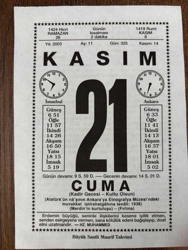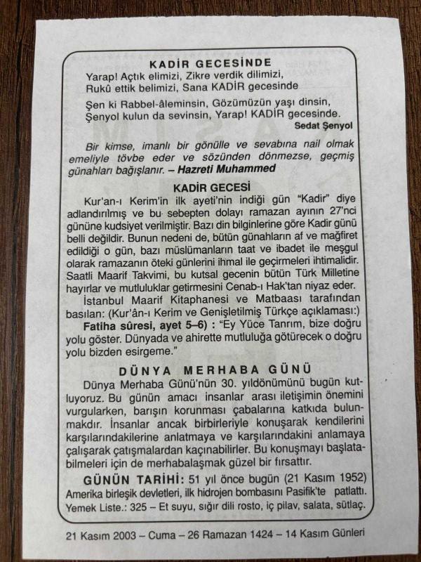 21 KASIM 2003 - TAKVİM YAPRAĞI - DOĞUM GÜNÜ HEDİYESİ - BÜYÜK SAATLİ MAARİF TAKVİMİ - HZ.MUHAMMED - SEDAT ŞENYOL - KADİR GECESİ - DÜNYA MERHABA GÜNÜ - AMERİKA İLK HİDROJEN BOMBASINI PASİFİK'E ATTI, en son 8 ay önce güncellenmiştir.