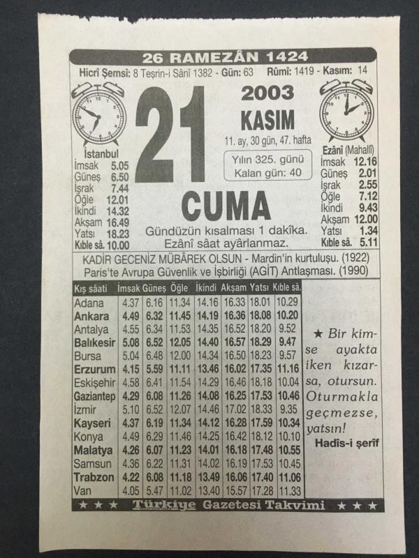 21 KASIM 2003-TAKVİM YAPRAĞI-DOĞUM GÜNÜ HEDİYESİ-TÜRKİYE GAZETESİ TAKVİMİ,MARDİNİN KURTULUŞU,1922,PARİSTE AGİT ANLAŞMASI 1990,KADİR GECESİ, en son 8 ay önce güncellenmiştir.