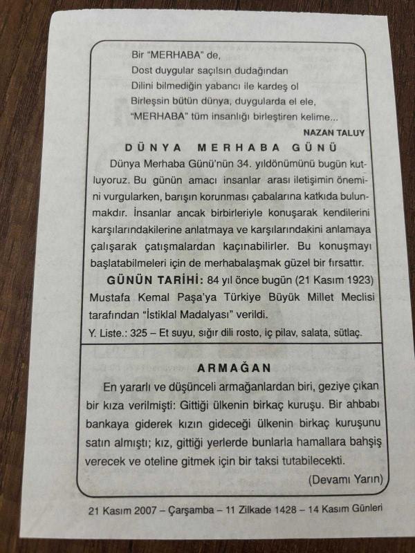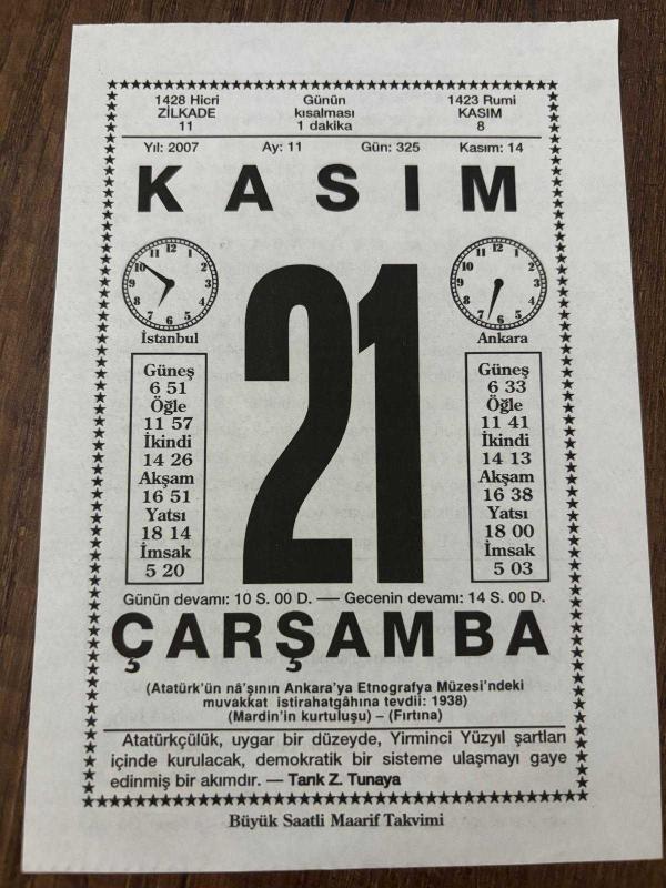 21 KASIM 2007 - TAKVİM YAPRAĞI - DOĞUM GÜNÜ HEDİYESİ - BÜYÜK SAATLİ MAARİF TAKVİMİ - TARIK Z.TUNAYA - NAZAN TALUY - DÜNYA MERHABA GÜNÜ - MUSTAFA KEMAL PAŞAYA İSTİKLAL MADALYASI VERİLDİ, en son 8 ay önce güncellenmiştir.