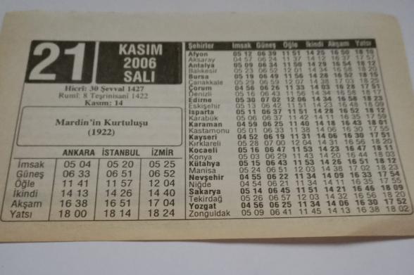 21 Kasım 2006-Orijinal Takvim Yaprağı-Doğum Günü-Söz,Nişan,Nikâh,Düğün ve Önemli Günler Hediyesi-ERAŞ Hizmet Takvimi-Ayet-Hadis(Mardin'in Kurtuluşu(1922))-Zilkade Hilali-Çocuğunuza İsim:Haydar,Hayal, en son 3 ay önce güncellenmiştir.