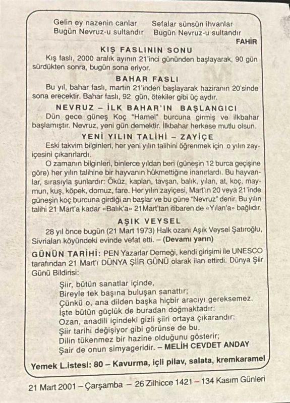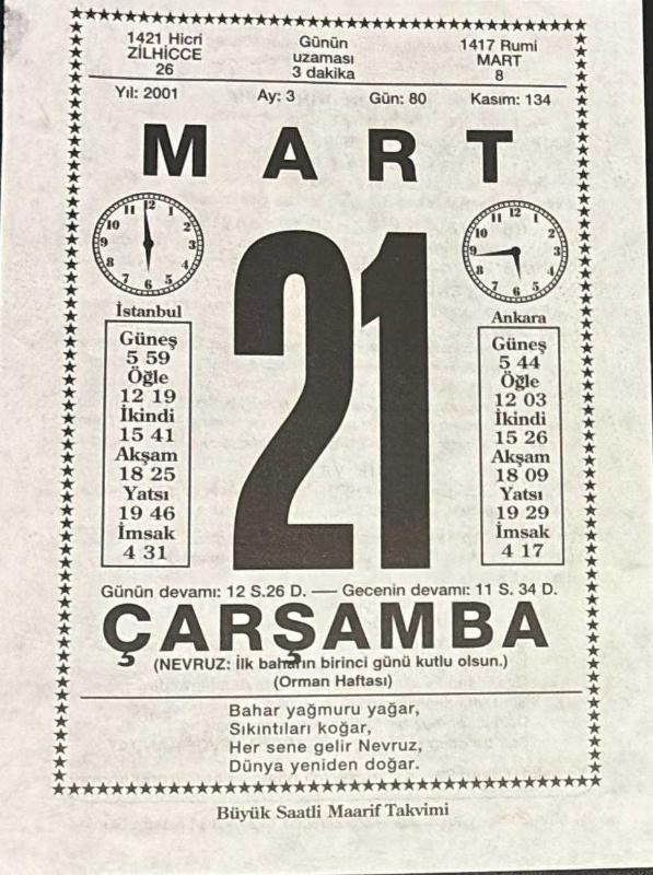 21 MART 2001 - TAKVİM YAPRAĞI - DOĞUM GÜNÜ HEDİYESİ - BÜYÜK SAATLİ MAARİF TAKVİMİ - NEVRUZ- FAHİR- KIŞ FASLININ SONU - BAHAR FASLI - YENİ YILIN TALİHİ, ZAYİÇE - AŞIK VEYSEL - DÜNYA ŞİİR GÜNÜ - MELİH CEVDET ANDAY, en son 8 ay önce güncellenmiştir.