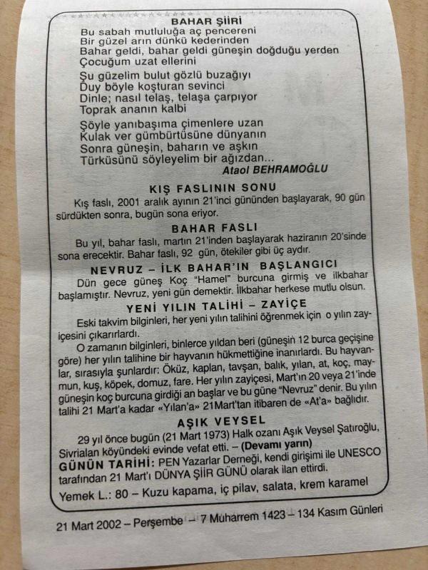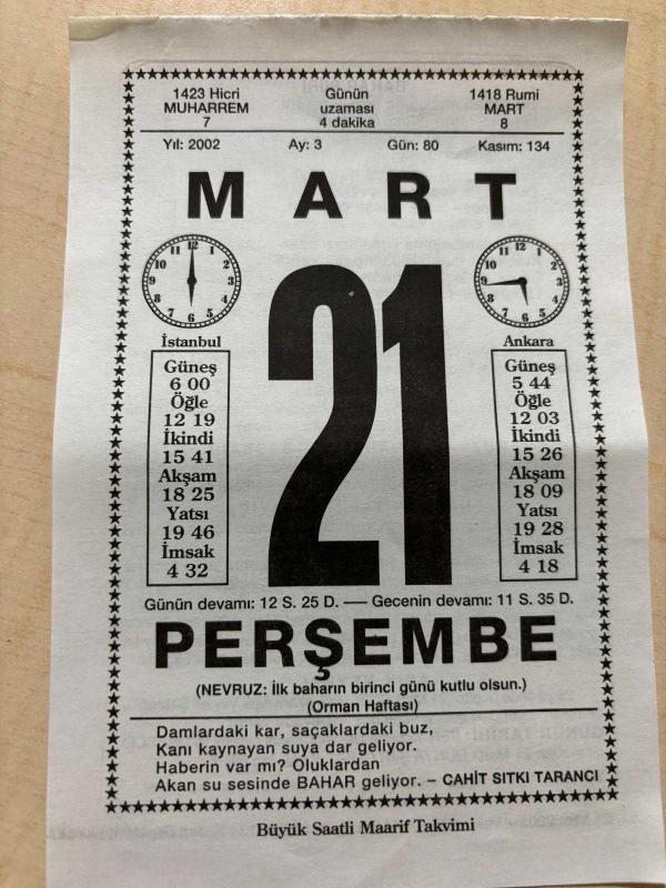 21 MART 2002 - TAKVİM YAPRAĞI - DOĞUM GÜNÜ HEDİYESİ - BÜYÜK SAATLİ MAARİF TAKVİMİ - CAHİT SITKI TARANCI - ATAOL BEHRAMOĞLU - KIŞ FASLININ SONU - NEVRUZ - YENİ YILIN TALİHİ - AŞIK VEYSEL - DÜNYA ŞİİR GÜNÜ, en son 8 ay önce güncellenmiştir.