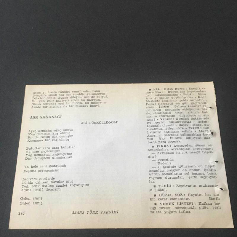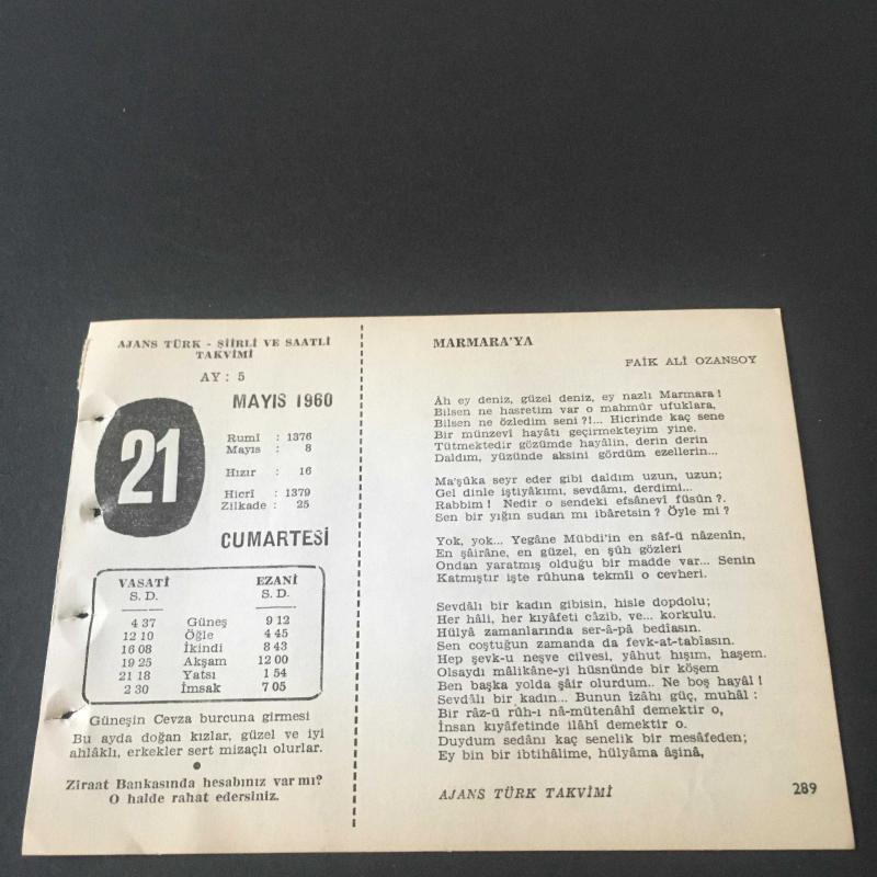 21 MAYIS 1960-TAKVİM YAPRAĞI-DOĞUM GÜNÜ HEDİYESİ- AJANS TÜRK-ŞİİRLİ VE SAATLİ TAKVİMİ,FAİK ALİ OZANSOY,ALİ PÜSKÜLLÜOĞLU,FAL,FIKRA,ZİGETVARIN MUHASARASI 1556,GÜZEL SÖZ,YEMEK LİSTESİ, 1 yıl önce satışa sunulmuştur.